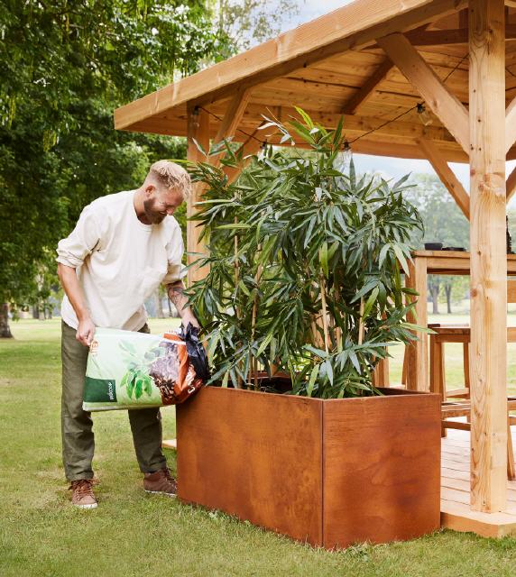 BLUMENKÄSTEN AUS CORTENSTAHL werden als Bausätze geliefert. Das Paket enthält vier Seitenwände aus Cortenstahl, eine Bodenplatte mit Löchern für den Wasserabfluss, Befestigungssätze und eine Montagean ...