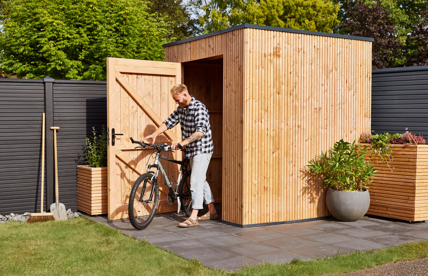 GARTENHÄUSCHEN DURBIN Die Kombination aus schlankem Design und dreifachem Profil aus Red Class Holz verleiht dem Durbin ein modernes und doch warmes Aussehen. Das Gerätehäuschen ist in zwei Größen erhältlich und kann mit einer passenden Mülltonnenbox erweitert werden, die auch separat bestellt werden kann.
